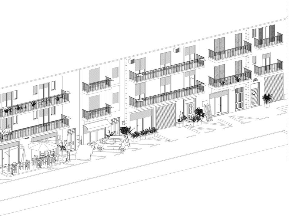 Afin de confronter les usages, l’amélioration des Frontage des façades en vis-à-vis de la piazza est proposé autour d’un travail de seuils, de matérialité et surélévation de la circulation piétonne. Les différents seuils selon le programme du RDC sont marqués par un calepinage différent mais aussi largeur différente selon l’usage. Cette différence de largeur permet aussi d’un cote la création de stationnement parallèle nécessaire au bon fonctionnement de ces façades.