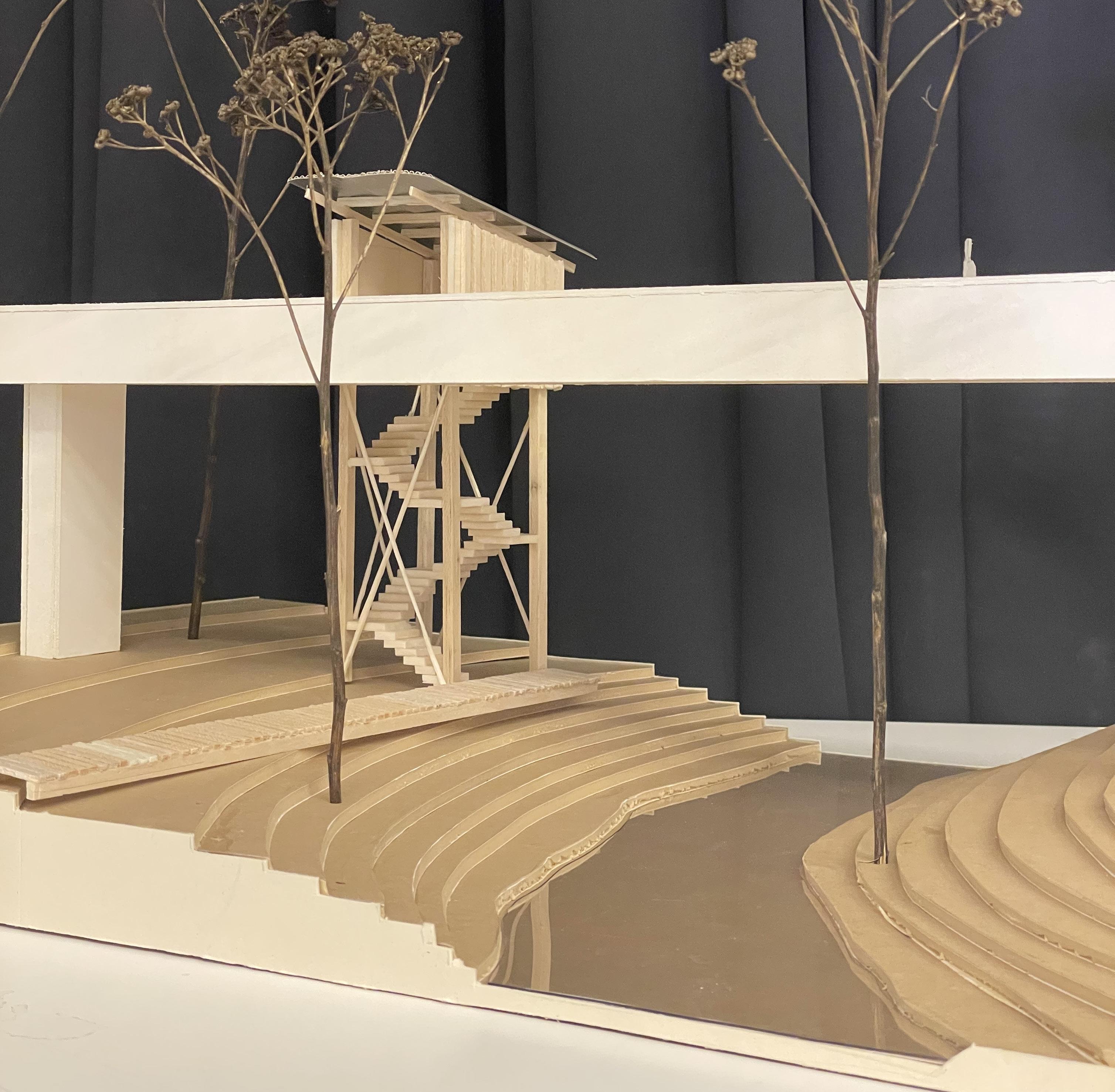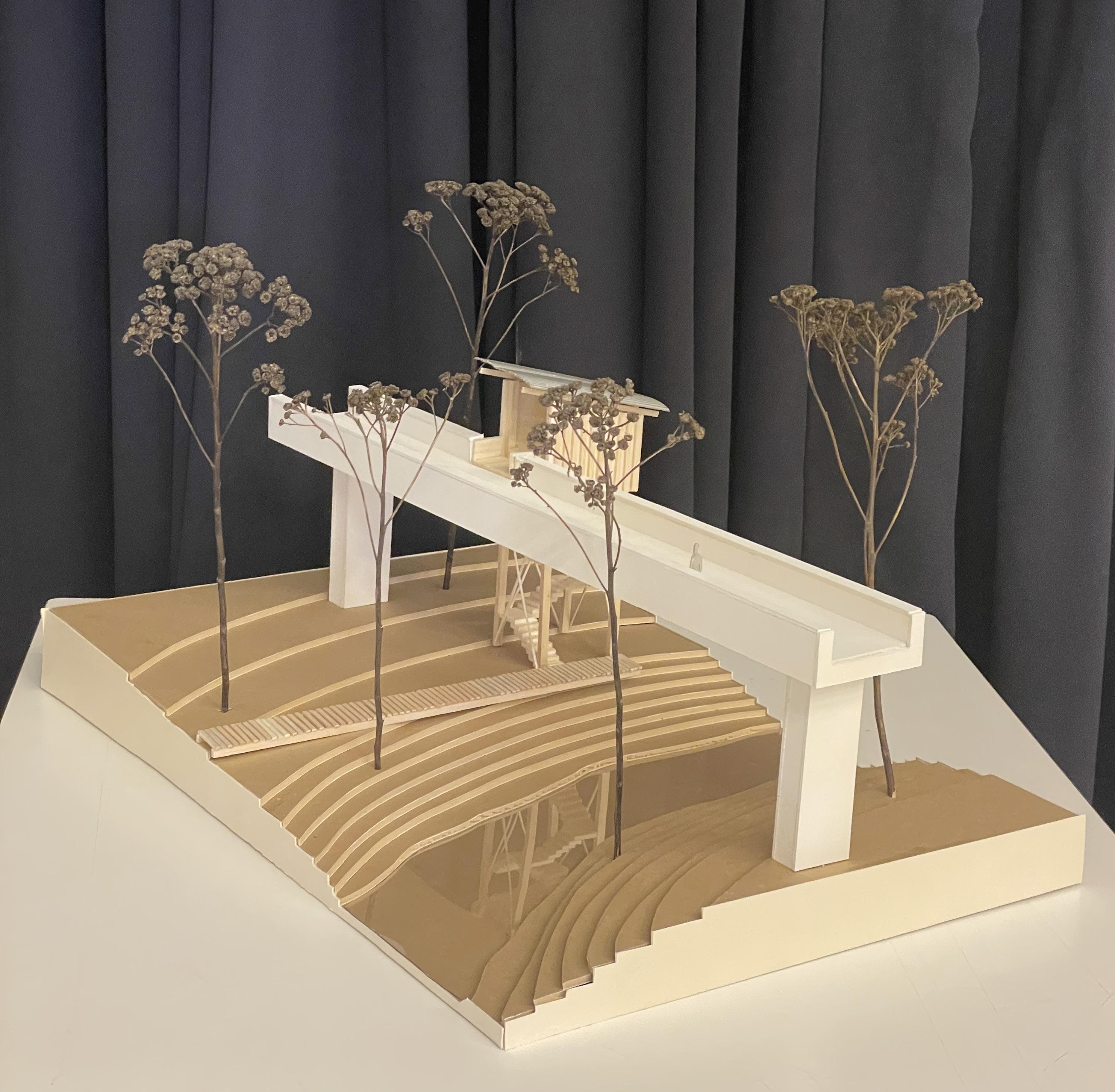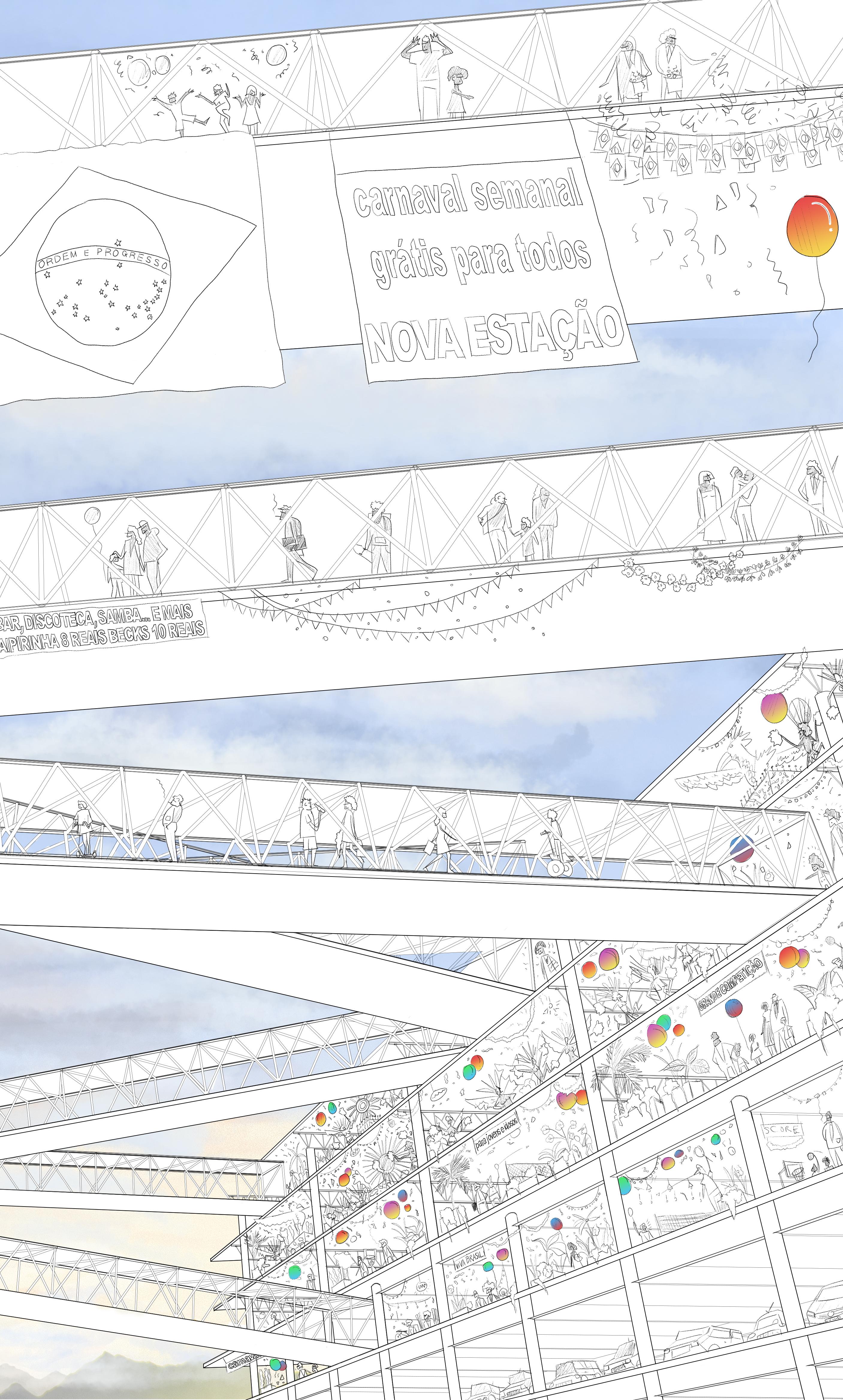 Nous avons pensé qu’un moyen de prévenir de cette urbanisation massive et des inondations était de concevoir une passerelle piétonne qui suit le cours de la rivière. Son chemin crée des zones non constructibles aux abords de la rivière permettant à la nature de se déployer. Cette passerelle en béton forme une grande ligne dans le paysage montagneux de Rio de Janeiro. Pour prévenir des inondations possibles de cette rivière, des bassins de rétentions sont conçus le long de la rivière en différents