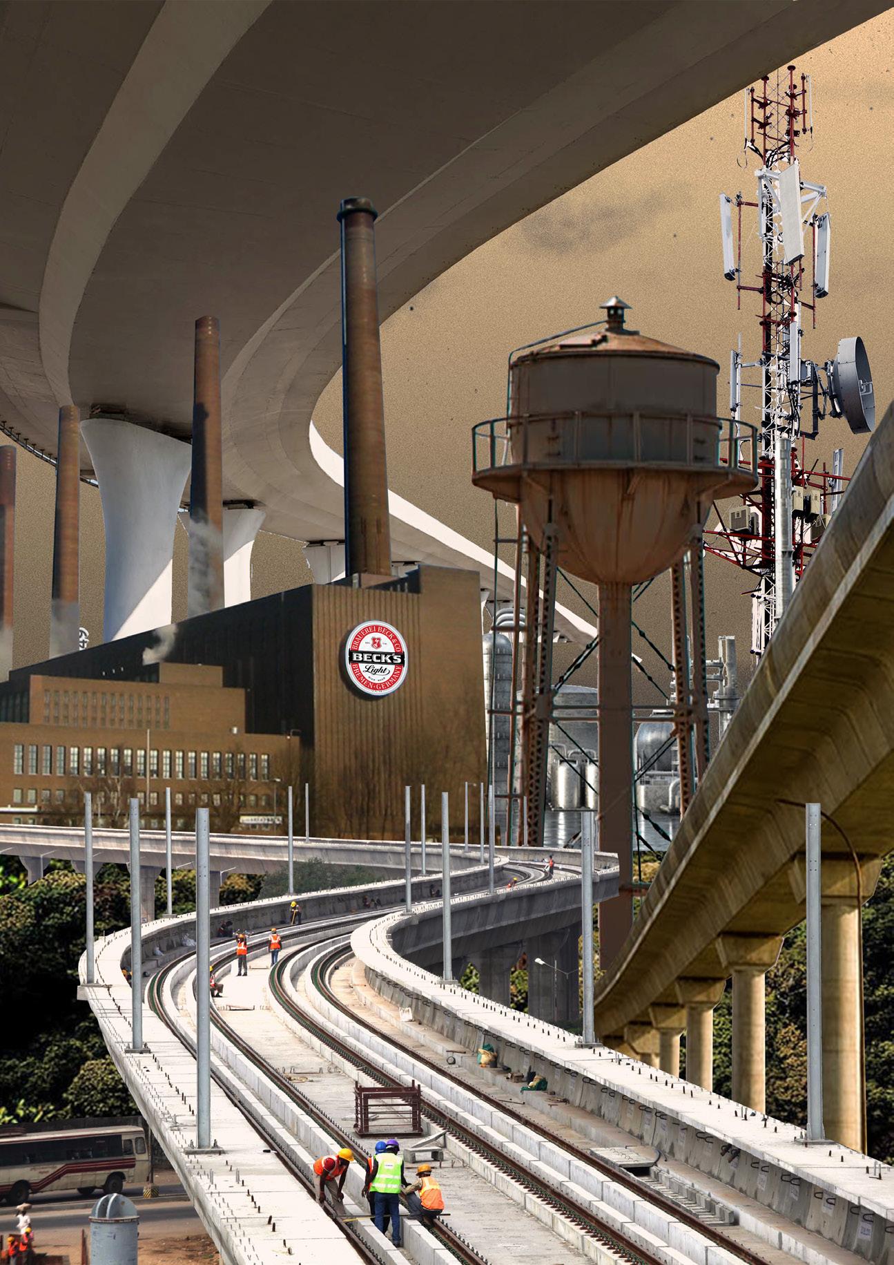 Les trois objets sont reliés par une ligne infrastructurelle grande vitesse, sous la forme d’une simple plateforme autoroutière surélevée.