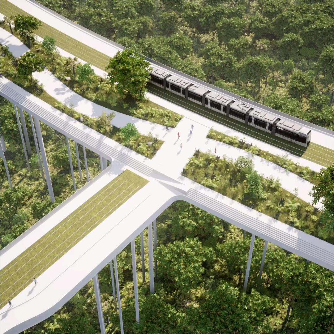 Cette infrastructure est une passerelle de 1 km de diamètre, sur laquelle est implanté un système de transport rapide, une voie piétonne et une piste cyclable, le tout dans un cadre verdoyant.
