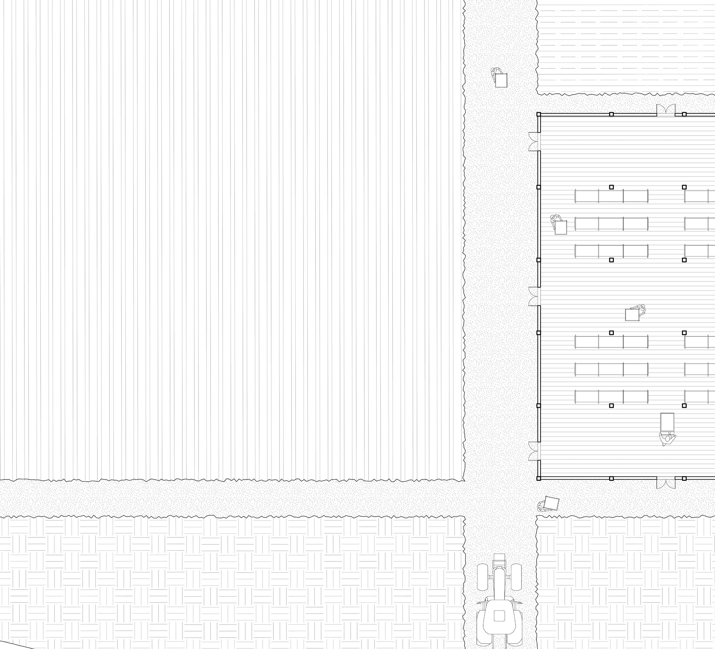 points, liés à la passerelle, pour garder l’eau pendant les fortes pluies et empêcher l’urbanisation dans ces zones. Pour permettre aux habitants d’interagir avec la rivière, des petits programmes construits en bois viennent, comme des artefacts, activer ces bassins en lieux baignades.Le cours de la rivière permet aussi de créer des réseaux de drainage pour alimenter en eau des champs le long de la rivière, un autre moyen d’empêcher l’urbanisation proche de la rivière. Les paysans peuvent ainsi stocker leurs récoltes leurs machines dans les nouveaux bâtiments en bois.