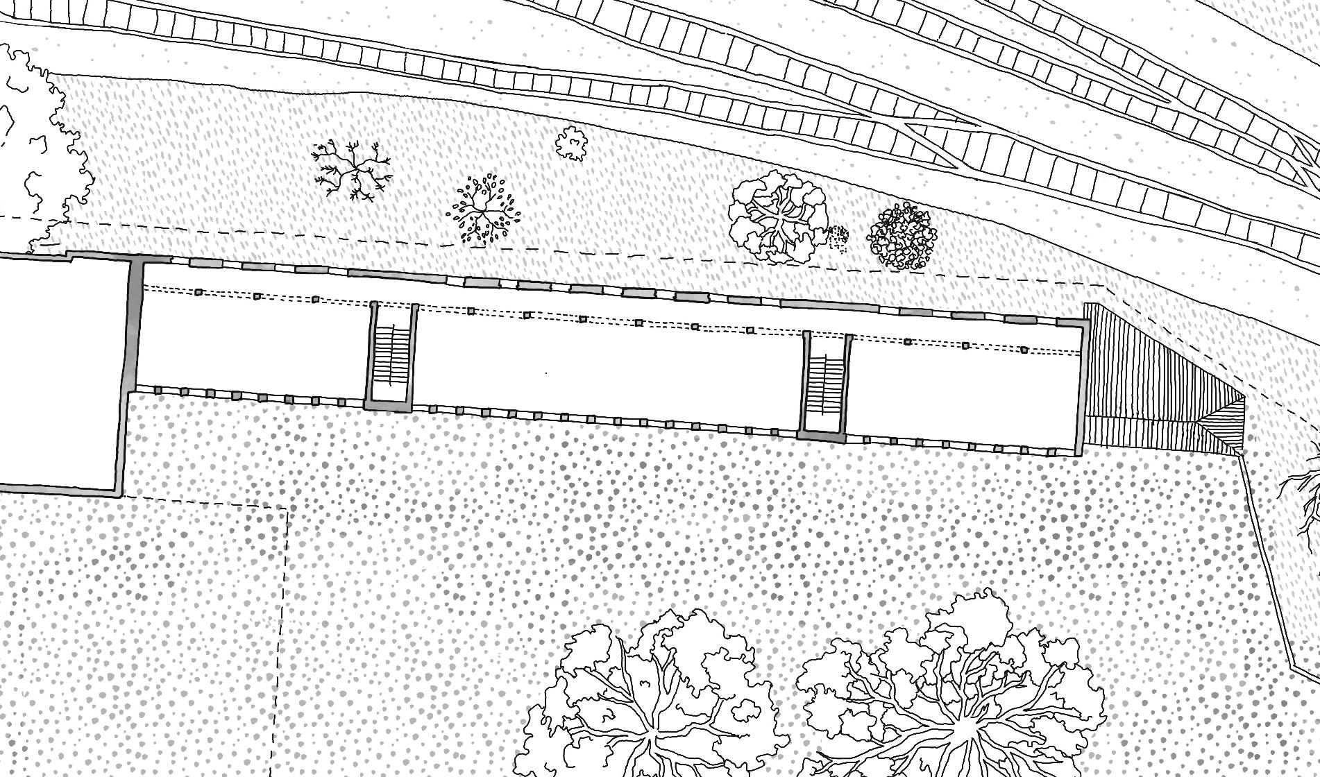Le rez-de-chaussée s’ouvre vers l’intérieur du site et un parc urbain. Le travail paysager met en valeur les fissures du goudron, accompagnant et accentuant la déminéralisation du site pour créer un environnement plus vert et accueillant. Il s’agit de prendre les phénomènes déjà en marches, de les accompagner et de les accentuers.