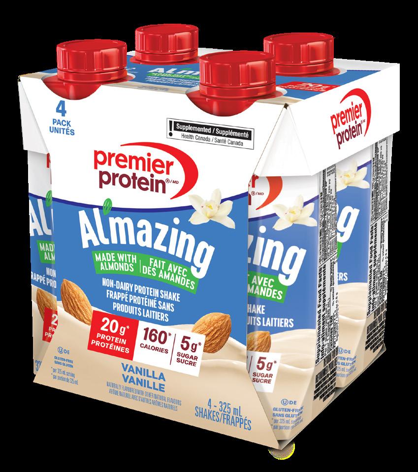 Premier Protein is stepping into the plant-based space in Canada with the launch of Al’mazing NonDairy Protein Shakes in Vanilla and Coffee flavours. Made using real almonds, these shakes deliver a smooth, creamy texture, 20 grams of protein, 160 calories and only five grams of sugar.