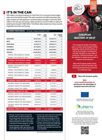 3 Canned corn may be down 3% in both dollar and unit sales, but it’s still the secondhighest selling canned veggie on the list (next to tomatoes) at $71 million in sales. 4 Popeye’s favourite food, canned spinach, has seen much stronger days: dollar sales were down by a whopping 43% to only $353,043, while unit sales were down 33% to just $210,028. SOURCE: NIELSEN, NATIONAL, ALL CHANNELS, ALL SALES, EXCLUDING N.L.