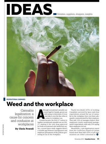 lthough recreational cannabis use is now legal in Canada, grocers are still trying to determine if even one toke is over the line when it comes to workplace use. Canada became the first G7 nation to legalize recreational cannabis use on Oct. 17, making it the only drug approved for both recreational and medicinal use. Yet, a recent Ipsos study suggests there’s a sizeable gap between management and employee perceptions of the policies governing its use in the workplace.