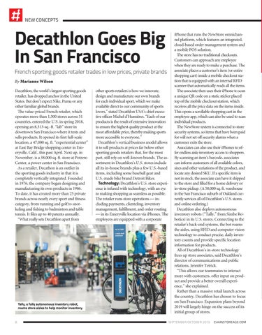 iPhone that runs the NewStore omnichannel platform, which features an integrated, cloud-based order management system and a mobile POS solution. The store has no traditional checkouts. Customers can approach any employee when they are ready to make a purchase. The associate places a customer’s item (or entire shopping cart) inside a mobile checkout station that is equipped with an internal RFID scanner that automatically reads all the items. The associate then uses their iPhone to scan a unique QR code on a static sticker placed top of the mobile checkout station, which receives all the price data on the items inside. This opens a scrollable shopping cart in the employee app, which can also be used to scan individual products. The NewStore system is connected to store security systems, so items that have been paid for will not set off security alarms when a customer exits the store. Associates can also use their iPhones to offer endless aisle inventory access to shoppers. By scanning an item’s barcode, associates can inform customers of all available colors, sizes and other variations of the product, and locate any desired SKU. If a specific item is not in stock, the associate can have it shipped to the store and filled for a home delivery or in-store pickup. (A 50,000 sq. ft. warehouse in the San Francisco suburb of Oakland currently services all of Decathlon’s U.S. stores and online ordering.) Decathlon also deploys autonomous inventory robots (“Tally,” from Simbe Robotics) in its U.S. stores. Connecting to the retailer’s back-end systems, the bot roams the aisles, using RFID and computer vision technology to conduct precise, daily inventory counts and provide specific location information for products. All of Decathlon’s in-store technology frees up store associates, said Decathlon’s director of communications and public relations, Jennifer Tetrick. “This allows our teammates to interact more with customers, offer input on product and provide a better overall experience,” she explained. Rather than a massive retail launch across the country, Decathlon has chosen to focus on San Francisco. Expansion plans beyond 2019 will largely hinge on the success of its initial group of stores.