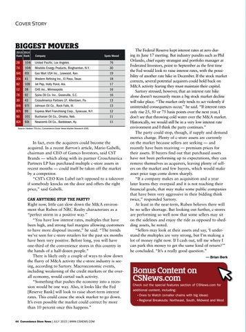 Right now, little can slow down the M&A environment that Ruben of NRC Realty characterizes as a “perfect storm in a positive way.” “You have low interest rates, multiples that have been high, and strong fuel margins allowing customers to have more disposal income,” he said. “The trends we’ve seen for c-store retailers for the past six months have been very positive. Before long, you will have one-third of the convenience stores in this country in the hands of a half-dozen people.” There is likely only a couple of ways to slow down the flurry of M&A activity the c-store industry is seeing, according to Sartory. Macroeconomic events, including weakening of the credit markets or the overall economy, would curtail such activity. “Something that pushes the economy into a recession would be one way. Also, it looks like the Fed [Reserve Bank] will look to raise short-term interest rates. This could cause the stock market to go down. It’s even possible the market could correct by more than 10 percent once this happens.” 44 Convenience Store News | JULY 2015 | WWW.CSNEWS.COM