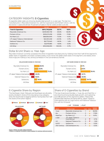 CATEGORY INSIGHTS: E-Cigarettes E-cigarette dollar sales are showing double-digit growth vs. a year ago. The top two manufacturers — Reynolds American Inc. with its Vuse brand, and Fontem US Inc. with its blu brand — captured almost 75 percent of sales in the 52 weeks ended June 30. DOLLARS