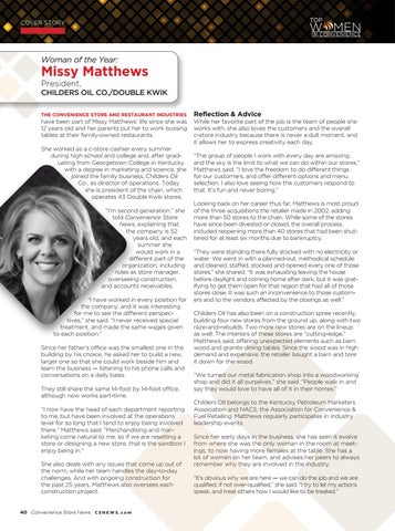 “The group of people I work with every day are amazing, and the sky is the limit to what we can do within our stores,” Matthews said. “I love the freedom to do different things for our customers, and offer different options and menu selection. I also love seeing how the customers respond to that. It’s fun and never boring.” Looking back on her career thus far, Matthews is most proud of the three acquisitions the retailer made in 2002, adding more than 50 stores to the chain. While some of the stores have since been divested or closed, the overall process included reopening more than 40 stores that had been shuttered for at least six months due to bankruptcy. “They were standing there fully stocked with no electricity or water. We went in with a planned-out, methodical schedule and cleaned, staffed, stocked and opened every one of those stores,” she shared. “It was exhausting leaving the house before daylight and coming home after dark, but it was gratifying to get them open for that region that had all of those stores close. It was such an inconvenience to those customers and to the vendors affected by the closings as well.” Childers Oil has also been on a construction spree recently, building four new stores from the ground up, along with two raze-and-rebuilds. Two more new stores are on the lineup as well. The interiors of these stores are “cutting-edge,” Matthews said, offering unexpected elements such as barn wood and granite dining tables. Since the wood was in high demand and expensive, the retailer bought a barn and tore it down for the wood. “We turned our metal fabrication shop into a woodworking shop and did it all ourselves,” she said. “People walk in and say they would love to have all of it in their homes.” Childers Oil belongs to the Kentucky Petroleum Marketers Association and NACS, the Association for Convenience & Fuel Retailing. Matthews regularly participates in industry leadership events. Since her early days in the business, she has seen it evolve from where she was the only woman in the room at meetings, to now having more females at the table. She has a lot of women on her team, and advises her peers to always remember why they are involved in the industry. “It’s obvious why we are here — we can do the job and we are qualified, if not over-qualified,” she said. “I try to let my actions speak, and treat others how I would like to be treated.”
