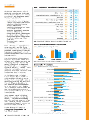 • I mplementation of more rigorous cleaning (instituted by 89 percent), • Installation of social distancing markers (84 percent), • Installation of plexiglass barriers at checkout (78 percent), • Requiring employees to wear face coverings (73 percent), • Implementing protective measures at self-service food (59 percent), • Implementing protective measures at self-service beverage (56 percent), and • Reducing in-store capacity (57 percent). While both small and large operators in the industry are enacting safety measures, the research shows that such moves are more commonplace among large operators, particularly when it comes to adapting self-service food and beverage stations. Interestingly, as common as measures to prevent the spread of COVID-19 are currently, more rigorous cleaning is the only change that more than half (58 percent) cite as likely to remain long term. This is followed by plexiglass barriers at checkout (37 percent), social distancing markers (31 percent), and protective measures at self-service food and beverage (both 26 percent). As c-stores try to get customers back in the door, they're most likely to lean on digital promotions. About a third say they’ve increased foodservice promotions in the past year, while more than half (54 percent) said they’ve kept their level of promotions steady. Large operators were more likely to amp up their level of promotions in the past year, as 46 percent reported an increase compared to just 23 percent of small operators. Social media is the top channel for foodservice promotion (cited by 58 percent). Other leading channels for promotion are loyalty programs (47 percent), e-mail (29 percent), proprietary mobile coupons/apps (23 percent) and text messages (23 percent). CSN Look in the September issue of Convenience Store News for part two of this research.