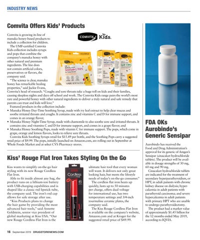 Comvita Offers Kids’ Products Comvita is growing its line of manuka honey-based products to include a collection for children. The UMF-certified Comvita Kids collection includes syrups and pops that combine the company’s manuka honey with other natural and premium ingredients. The line does not contain artificial colors, preservatives or flavors, the company said. “The science is clear, manuka honey has remarkable healing properties,” said Jackie Evans, Comvita’s head of research. “Coughs and sore throats take a huge toll on kids and their families, causing sleepless nights and days off school and work. The Comvita Kids range pairs the world’s most rare and powerful honey with other natural ingredients to deliver a truly natural and safe remedy that parents can trust and kids will love.” Featured products in the collection include: • Manuka Honey Day-Time Soothing Syrup, made with ivy leaf extract to help clear mucus and soothe irritated throats and coughs. It contains zinc and vitamins C and D for immune support, and comes in an orange flavor; • Manuka Honey Night-Time Syrup, made with chamomile to also soothe sore and irritated throats. It contains zinc and vitamins C and D for immune support, and comes in a grape flavor; and • Manuka Honey Soothing Pops, made with vitamin C for immune support. The pops, which come in grape, orange and lemon flavors, looks to relieve sore throats. Comvita Kids Soothing Syrups retail for $15.49 per bottle, and the Soothing Pops carry a suggested retail price of $9.99. The pops, initially launched on Amazon.com, are rolling out in September at Whole Foods Market and at select CVS Pharmacy stores.