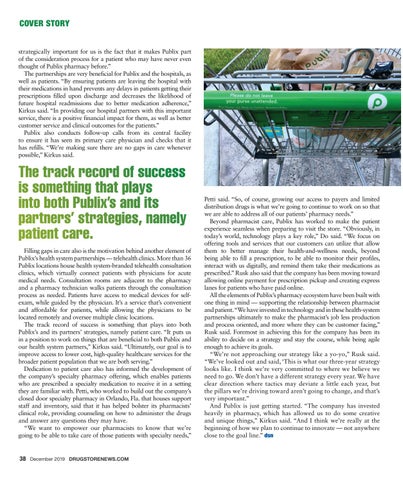COVER STORY strategically important for us is the fact that it makes Publix part of the consideration process for a patient who may have never even thought of Publix pharmacy before.” The partnerships are very beneficial for Publix and the hospitals, as well as patients. “By ensuring patients are leaving the hospital with their medications in hand prevents any delays in patients getting their prescriptions filled upon discharge and decreases the likelihood of future hospital readmissions due to better medication adherence,” Kirkus said. “In providing our hospital partners with this important service, there is a positive financial impact for them, as well as better customer service and clinical outcomes for the patients.” Publix also conducts follow-up calls from its central facility to ensure it has seen its primary care physician and checks that it has refills. “We’re making sure there are no gaps in care whenever possible,” Kirkus said.