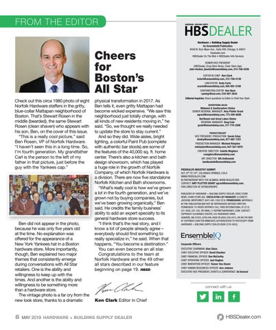 Cheers for Boston’s All Star Check out this circa 1980 photo of eight Norfolk Hardware staffers in the gritty, blue-collar Mattapan neighborhood of Boston. That’s Stewart Rosen in the middle (bearded), the same Stewart Rosen (clean shaven) who appears with his son, Ben, on the cover of this issue. “This is a really cool picture,” said Ben Rosen, VP of Norfolk Hardware. “I haven’t seen this in a long time. So, I’m fourth generation. My grandfather Carl is the person to the left of my father in that picture, just before the guy with the Yankees cap.”