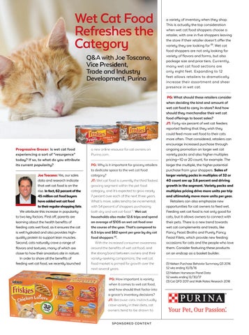 a new online resource for cat owners on Purina.com. PG: Why is it important for grocery retailers to dedicate space to the wet cat food category? JT: Wet cat food is currently the third fastest growing segment within the pet food category, and it’s expected to grow nearly 7 percent over each of the next three years. What’s more, sales tend to be incremental, with 54 percent of shoppers purchasing both dry and wet cat food (1). Wet cat households also make 12.6 trips and spend an average of $105 on wet cat food over the course of the year. That’s compared to 6.5 trips and $82 spent per year by dry cat food shoppers (2). With the increased consumer awareness around the benefits of wet cat food, and the strong bond between owners and their variety-seeking companions, the wet cat food market is primed for growth over the next several years. PG: How important is variety when it comes to wet cat food, and how should that factor into a grocer’s inventory decisions? JT: Because cats instinctually crave variety in their diets, cat owners tend to be drawn to S P O N S O R E D CO N TE N T