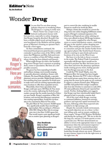 ’m sure that I’m not alone among industry observers in wondering where The Kroger Co. is going to strike next. Harris Teeter was a major score, a beloved southeastern banner with best practices, especially in online shopping, that Kroger hungrily absorbed. Roundy’s has been a double-edged sword, giving Kroger a new beachhead in the Midwest and the golden goose of Mariano’s fronting an operator that’s basically a fixer-upper. As these assimilations continued, the Cincinnati-based grocery giant became a serious contender to purchase some of the 500 to 1,000 stores that Walgreens and Rite Aid need to jettison as a condition of their $17 billion merger, whose closing has been delayed until January. What might Kroger do with a few hundred drug stores? Kroger won’t comment on pending deals, rumor or speculation. But here are a few possible scenarios. The grocer has been expanding its healthand-wellness strategy, most recently merging its specialty pharmacy subsidiary, Axium, with Orlando, Fla.-based ModernHealth, a specialty pharmacy services provider. Might Kroger launch a free-standing drug store operation? It would seem to make more sense for existing supermarket pharmacy locations to offer these expanded services. Meanwhile, there’s been speculation that Kroger could open up to 300 Main & Vine stores across the country, replicating the fresh-focused market concept that the retailer launched in February near Seattle. Kroger’s acquisition of Rite Aid locations, and moving their pharmacy operations into existing supermarkets, would free up those sites to be converted to Main & Vine stores The pilot Main & Vine measures 30,000 square feet, significantly smaller than most Kroger supermarkets. But according to a February 2016 SEC filing by Rite Aid, its average store size is less than 13,000 square feet. That would require some significant buildout or creative space planning on Kroger’s