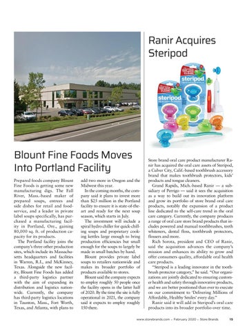 add two more in Oregon and the Midwest this year. In the coming months, the company said it plans to invest more than $25 million in the Portland facility to ensure it is state-of-theart and ready for the next soup season, which starts in July. The investment will include a spiral hydro chiller for quick-chilling soups and proprietary cooking kettles large enough to bring production efficiencies but small enough for the soups to largely be made in small batches by hand. Blount provides private label soups to retailers nationwide and makes its broader portfolio of products available to stores. Blount said the company expects to employ roughly 50 people once the facility opens in the latter half of 2020. By the time the site is fully operational in 2021, the company said it expects to employ roughly 150 there.