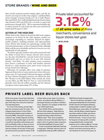 STORE BRANDS l WINE AND BEER their overall corporate growth strategy plans, and the demand is carrying over to the wine category,” said Kate Helm, senior manager of private brands at E. & J. Gallo Winery. She noted that E. & J. Gallo doubled its private brand volume sales between 2014 and 2018 and is on track to repeat that performance through 2022. “We’ve experienced double-digit volume growth in each of the last nine years and forecast similar growth again in 2021.”