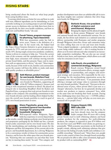 Gregory Heward, CEO, WSD Labs USA The only CEO on the rising stars list, he may have already risen, but the company leader younger than 40 years old is seeing private brands excel in teeth whitening solutions and hand sanitizer products for the company. For teeth-whitening products, the category is expected to pass $7.4 billion over the next four years and WSD’s retail clients are growing exponentially. “With economic uncertainty on the forefront of people’s minds, offering teeth whitening solutions that give the end user the feeling of youth, health and confidence is incredibly rewarding,” Heward said. “More than ever, people want to take control of their lives through brand ownership. We are proud to be able to offer a low investment, high quality product with an outstanding ROI.”