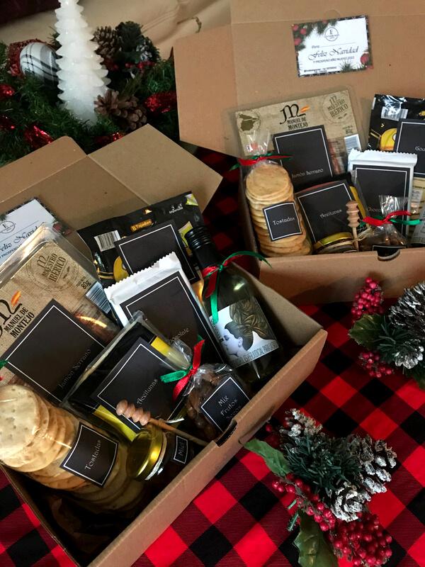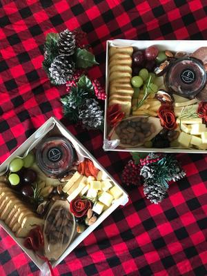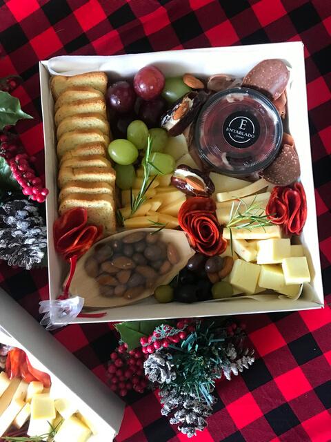Caja para armar tu propio Entablado, contiene: Jamón Serrano, Queso Gouda Ahumado, Aceitunas, Mix de Frutos Secos, Chocolate, Miel o Mermelada, Vino Piccolo y Tostadas