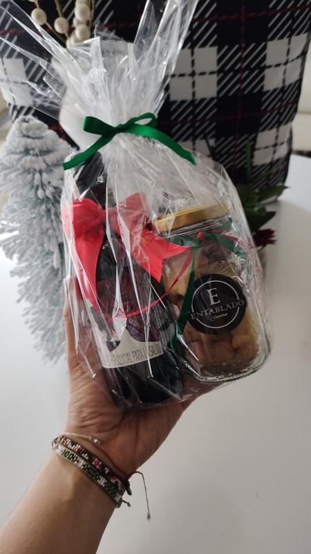 Frasco con deliciosas Galletas de Navidad (Mantequilla y Chocolate) acompañado de vino personal o sangría