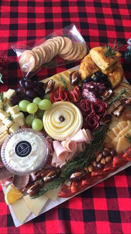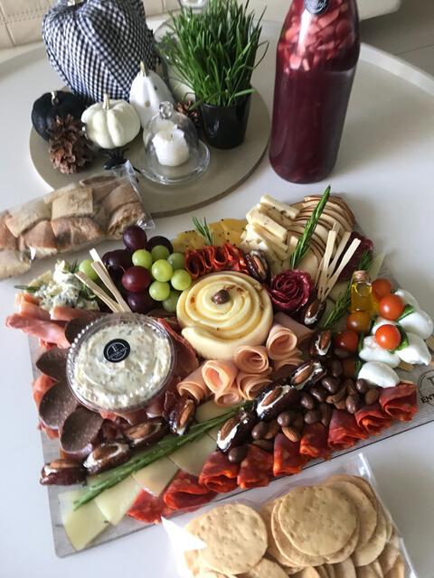 Tabla de madera con Jamón Serrano, Chor Español, Salami, Jamón de Pavo Ahumado Quesos Manchego, Gouda, Mozzarella, Pinc Capresse de Búfala, 7 Cueros en Almibar Ahumado o Pepper Jack, Queso Pera en Reducción Balsámica o Queso Azul, Uvas, M de Aceitunas, Dátiles Rellenos, Frutos Seco Dip & Tostadas