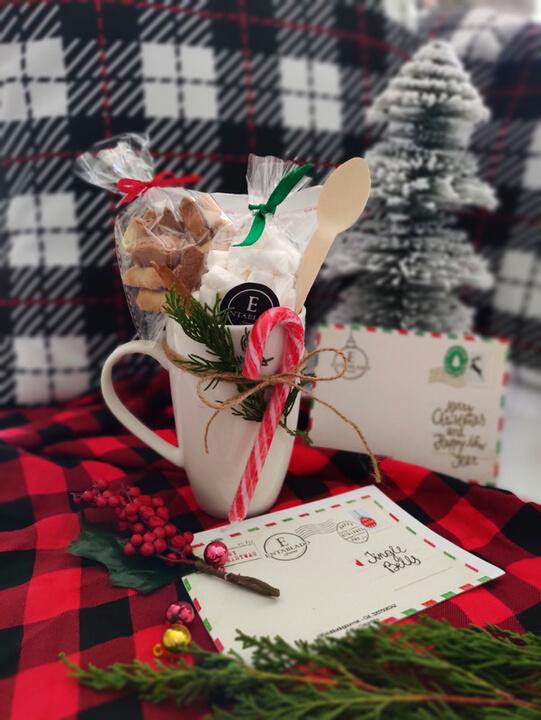 Tomate un momento para dar gracias y pensar en tus sueños. Mug especial con Cocoa Swiss Miss, Mini Marshmallows, Galletas Milano, Astilla de Canela, Bastón de caramelo, Cuchara de Madera, Velita y Hoja para Lista de Deseos Navideños con Lápiz y Borrador de navidad
