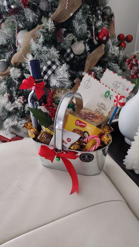 Hermosa can metálica con: Bo Vino, Galletas M Mini Panettone, Secos, Merme Frutos de Ant Tostadas, Bombo Chocolate, Bast Caramelo, Velita para Lista de D Navideños c Lápiz y Borrad Navidad