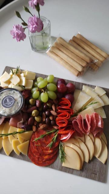 Tabla de madera con Jamón Serrano, Chorizo Español, Salami, Jamón de Pavo, Tortilla Española*, Queso Manchego, Pinchos Capresse, Queso 7 Cueros, Queso Gouda, Queso Mozzarella o Pera, Uvas, Mix de Aceitunas, Dátiles Rellenos, Frutos secos, Aceite de Oliva, Dips, Tostadas & Pan. 250.000