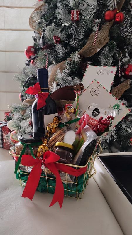 Hermosa canasta premium metálica con: Mini Tabla de Madera de Entablado Gourmet, Botella de Vino, Jamón Serrano, Queso Madurado, Galletas, Mix de Frutos Secos, Mermelada Frutos de Antaño, Tostadas, Baston de Caramelo, Bombones de Chocolate, Velita y Tarjeta Lista de Deseos con Lápiz de Navidad