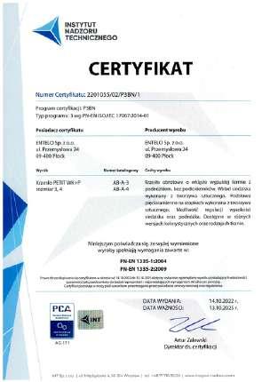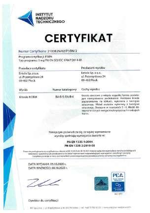 Certyfikat zgodności z normą PN-EN 1729-1:2016-02, PN-EN 1729-2+2016-02 z akredytacją Polskiego Centrum Akredytacji