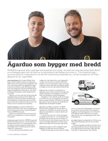 anstĂ€llda ser Ă€garduon att MSPB Entreprenad har möjlighet att vĂ€xa ytterligare de nĂ€rmaste Ă„ren. Viktigast Ă€r att det blir en resa som aldrig sker pĂ„ bekostnad av resultatet. Kunden ska alltid vara nöjd. â Vi stĂ„r för det vi gör och vi vill att vĂ„ra kunder ska uppfatta oss för det vi Ă€r â ett ordentligt företag pĂ„ alla plan. Det handlar inte bara om att göra ett bra jobb utan det Ă€r ocksĂ„ viktigt att passa tider, vara noga med att hĂ„lla arbetsplatsen i bra skick och ha schyssta arbetsvillkor för vĂ„r personal, sĂ€ger Petter. pĂ„ gĂ„ng att anlita en byggfirma tipsar byggduon om nĂ„gra saker man bör tĂ€nka pĂ„. â SĂ€rskilt som privatperson tycker jag det Ă€r viktigt OM MAN ĂR