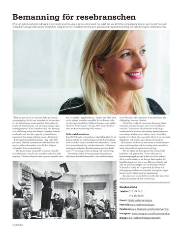 Resebemanning Telefon: 072 324 04 21 070 496 88 96 E-post: info@resebemanning.se Hemsida: www.resebemanning.se Facebook: www.facebook.com/Resebemanning Instagram: www.instagram.com/Resebemanning Blogg: www.resebemanning.se/bloggen 82 | NACKA