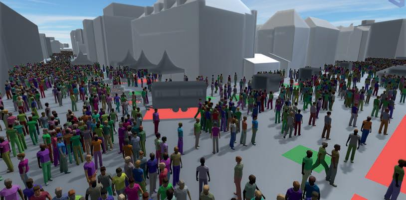 nement gevraagd wordt om diens simulatiedienst in te zetten, wordt er een simulatie gecreëerd in een digitale 3D-omgeving van het evenemententerrein, die je een beetje zou kunnen vergelijken met een serieuze versie van games als The Sims of RollerCoaster Tycoon. In deze omgeving worden bezoekersstromen gevisualiseerd en kunnen scenario's getest worden, zoals de in- en uitstroomden het publiek, maar ook het toetsen van show-stops en evacuaties. Hierdoor wordt het visueel inzichtelijk gemaakt waar knelpunten vormen in dit soort situaties. “Met een simulatie maak je een digitale omgeving waarin het hele festival staat ingetekend”, legt Kentie uit. “Denk bijvoorbeeld aan die ene bar die daar links of rechts van het podium moet staan. Maatregelen die worden genomen in de voorbereidingsfase kunnen met een andere blik bekeken en getoetst worden door een simulatie, waardoor organisatoren het terrein veiliger en effi ciënter kunnen inrichten.”