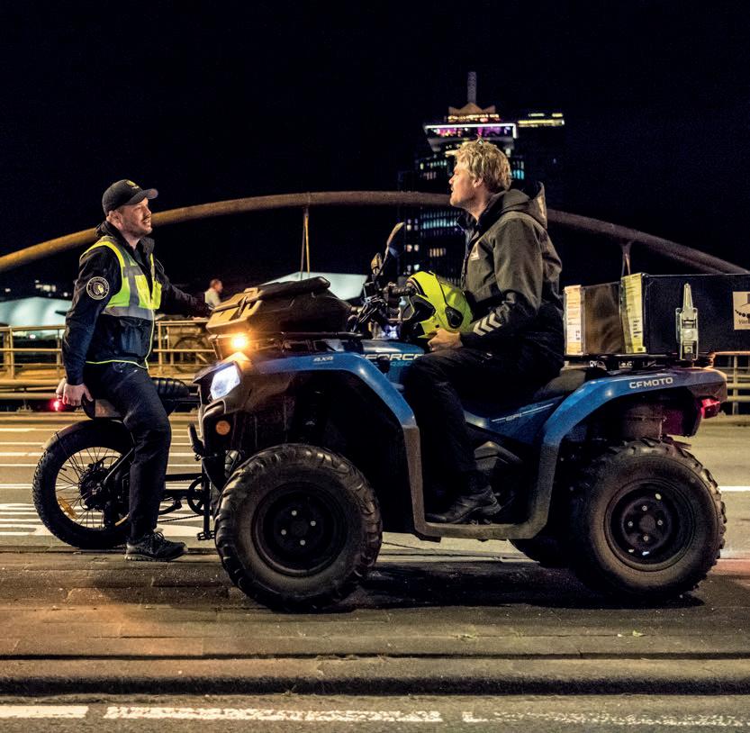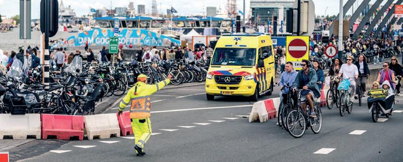 niet om ons, het draait om een evenement dat zo goed mogelijk moet verlopen. Zeker als het zo’n groot evenement is als SAIL, met honderdduizenden bezoekers op een dag en ontelbare stakeholders, dan moet je niet rigide vasthouden aan wat jouw taak is en wat die van een ander. Dan los je het ter plekke op, zodat het evenement er geen last van heeft.” Evenementen op een schaal van SAIL Amsterdam laten zich – hoe goed de voorbereiding ook is – niet in vaste scenario’s vangen. Zo was bijvoorbeeld het vuurwerk bij A'DAM Toren, wat tijdens de vorige editie nog op het Java-eiland was. Stalma: “Het werd achter Amsterdam CS drukker dan verwacht. Hier bleven in de avond dusdanig veel bezoekers kijken – in combinatie met de toch al drukkere SAIL – dat het risico zou kunnen ontstaan dat mensen in het water zouden kunnen vallen als er een druk op de menigte zou ontstaan. Dus hebben we direct de eerste nacht al bijgeschakeld en ruim 250 meter aan barriers langs de waterkant laten plaatsen. De volgende dag deed zich dan weer de situatie voor dat mensen met bootjes dachten ‘dat is mooi, daar kunnen we even aanleggen’, maar daar zijn die barriers natuurlijk niet op gemaakt. Dus moesten er borden worden geplaatst dat het verboden was aan te meren. Je moet continu blijven monitoren en bijsturen. Daar mag je niet in verslappen.”
