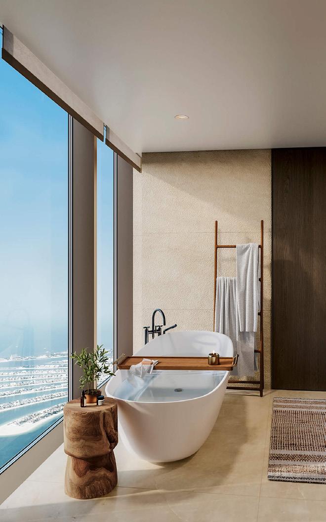 But this design evolution is more than aesthetic. The Middle East is fast becoming a global laboratory for residential innovation, and nowhere is that more apparent than in the integration of wellness into interior spaces. Wellness is no longer a luxury amenity—it is the new status symbol. Homes cater to circadian lighting, purified air systems, humiditybalancing technology, and spa-grade bathrooms equipped with chromotherapy showers, oversized free-standing tubs, heated stone, and sensor-driven controls. For many buyers, the bathroom is now the most important room in the property, often larger than secondary bedrooms and finished with stones sourced from Italy, Brazil or Turkey. The rise of private hammams—steam rooms inspired by centuries of regional bathing culture—has surged, fusing tradition with modern spa innovation.