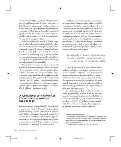 mún (actualmente 45 €/ha, más la posibilidad de cultivar agrocombustibles en la tierras de retirada o set-aside4); 2) desfiscalización total, ya que aproximadamente la mitad del precio de diésel y gasolina viene dado por impuestos energéticos; 3) obligación para los productores de diésel y gasolina de mezclar un cierto porcentaje de agrocombustibles a sus productos; 4) uso de agrocombustibles por empresas de transporte público. Esas cuatro medidas políticas necesitan financiación por parte de la Unión Europea (subsidios agrícolas), los gobiernos (reducción de los impuestos energéticos; aumento de los costes para las empresas de transporte público), conductores de coches (aumento de los precios finales). Por esa razón, es necesario un análisis integrado para discutir si se debe invertir recursos públicos en el sector de los agrocombustibles (además de una gran extensión de tierra, como se verá más tarde) es una estrategia aconsejable. En este artículo se comparan las ventajas en términos de reducción de la contribución antrópica al efecto invernadero y de contaminación urbana, de reducción de la dependencia energética y de apoyo al sector rural con los impactos previsibles, tomando como ejemplo datos de un estudio que analiza los posibles impactos del cumplimiento de los objetivos de la Directiva 2003/30/CE en Italia.5 Las conclusiones obtenidas para Italia son en general aplicables a muchos países europeos, caracterizados por un gran consumo energético, una alta densidad de población y un clima no tropical.
