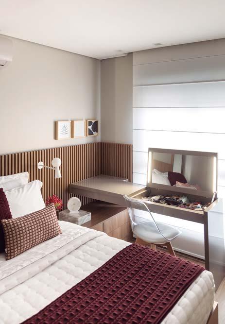 Na suíte a arquiteta optou por fazer a base da cama em marcenaria com tablado iluminado, que se interliga ao painel ripado em MDF fumê da cabeceira. O espaço abaixo da cama foi aproveitado para gavetas, já que um dos pedidos da cliente era um quarto com a máxima capacidade possível de armazenamento. Roupeiros com portas de palhinha trazem charme e modernidade para o ambiente. A bancada, com penteadeira oculta e luz frontal, transforma-se em espaço perfeito para maquiagem. O painel ripado conjuga todos os elementos, conferindo-lhes unidade e elegância.