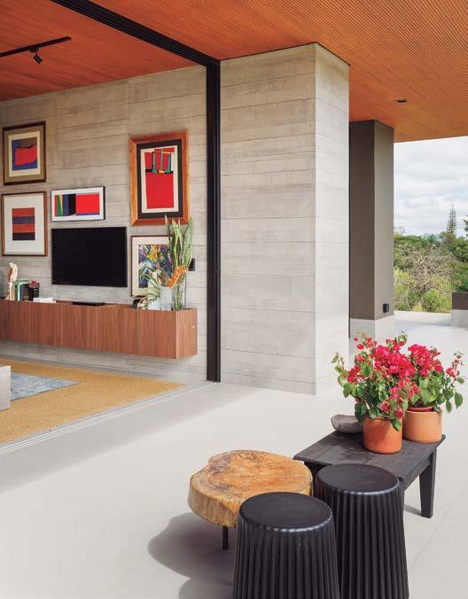 unir os ambientes, mantendo a base cimentícia. O uso do mesmo material para toda a área de pisos e revestimentos constrói uma linha conceitual atemporal e neutra, segundo os arquitetos.