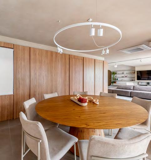 mesmos metais Rose Gold. Já no banheiro master, o destaque ficou por conta do Palazzo Ducale polido 81x140 cm, que sobressai no cenário, conferindo ao ambiente uma atmosfera de sofisticação e beleza.