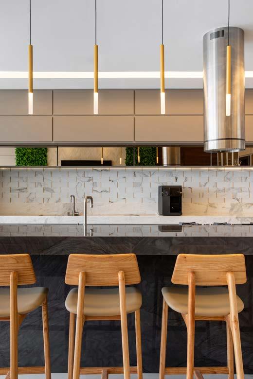 ara o casal de moradores, a cozinha deve ser a alma e o coração do lar. Foi pensando nisso que os profissionais propuseram uma integração acolhedora entre a cozinha, a sala de jantar e a área gourmet, formando um espaço ideal para a convivência com familiares e amigos. Uma ilha em MDF marmorizado, que concentra o cooktop e espaço com banquetas para o café da manhã, tornou-se o ponto central desse ambiente integrado.