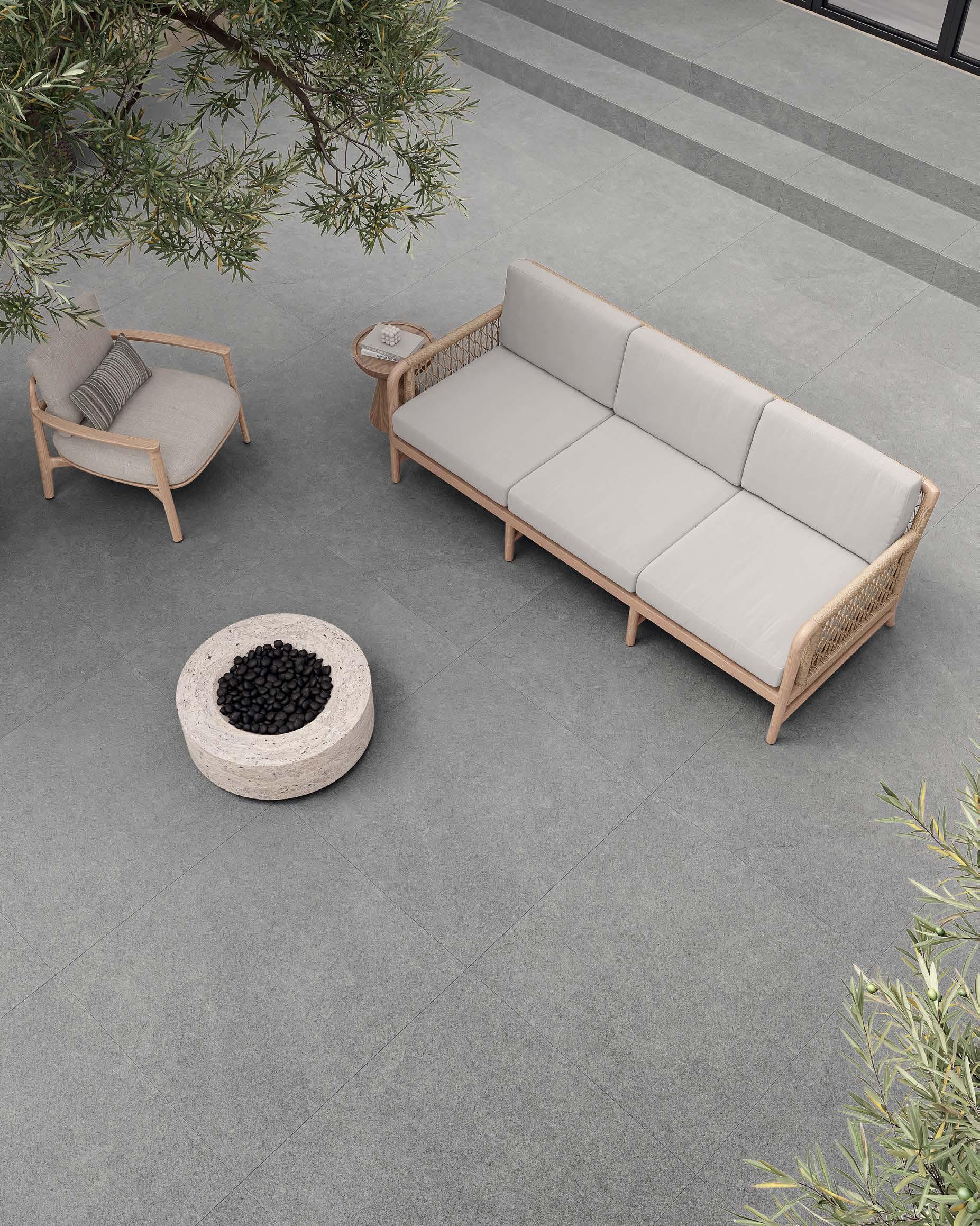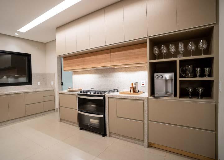 na, com seu acabamento Fiji em tons de verde, 20x20 cm, harmoniza com o paisagismo, sendo que o seu entorno recebeu a pedra atérmica cimentícia, 50x50 cm. A ala gourmet se destaca pelos tons neutros, especialmente com o piso York SGR 87x87 cm, tornando-se o coração da casa, o lugar ideal para receber amigos e familiares. O paisagismo emoldura a edificação com plantas que trazem vida e frescor. Por sua vez, a pérgola converte-se no centro das atenções dos convidados, atraindo olhares e proporcionando um agradável espaço para relaxar e socializar.