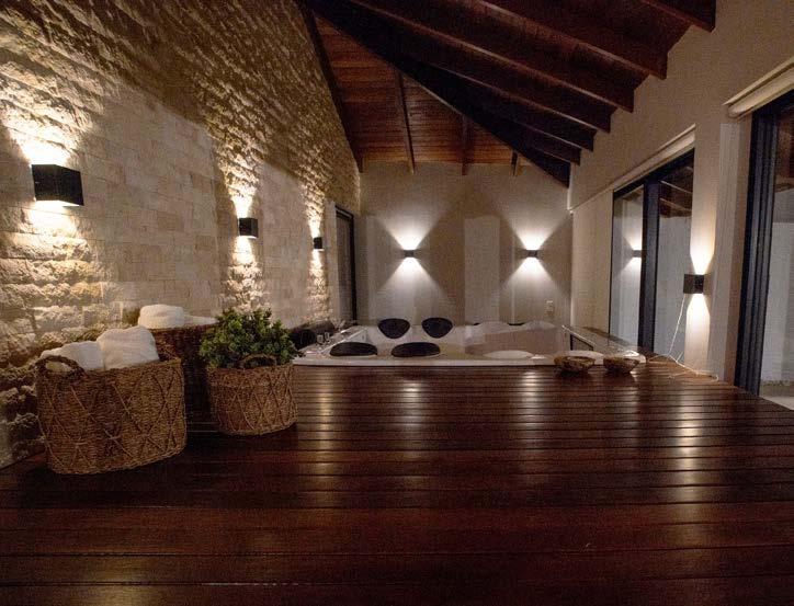 Um dos destaques decorativos da residência cabe ao Travertino Rockface 20x7 cm, que reveste a parede da sala de estar. É a mesma peça usada na fachada da casa e no SPA. Outro ponto em evi-