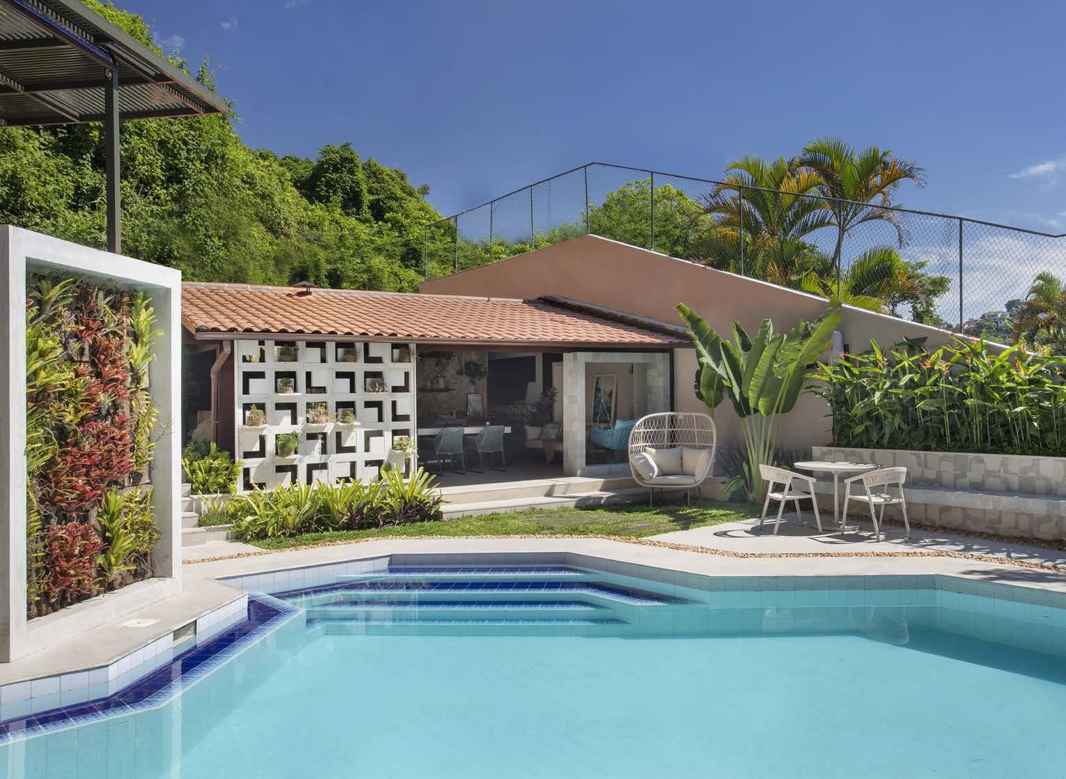 sta casa dos anos 80 fica no bairro de Laranjeiras, no Rio de Janeiro, um local rodeado por áreas de mata. O projeto de modernização da área externa manteve a estrutura do telhado da varanda, mas criou elementos inovadores: a divisória em cobogós de concreto Itacoa 40x40 cm e uma moldura ao redor do balanço em porcelanato Barlavento 14x14 cm. A casa de bombas ganhou novo visual, com a presença de um jardim vertical e de um pergolado para a prática de exercícios.
