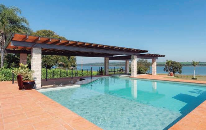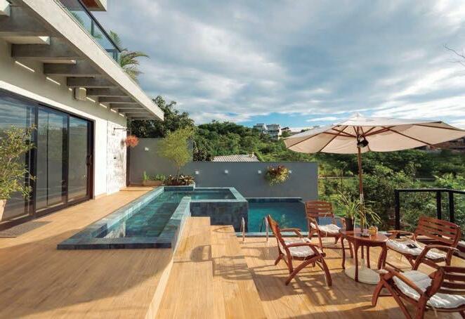 As tonalidades de azul das paredes e dos móveis planejados são o forte desta proposta, pois estabelecem um contraste sutil com os móveis rústicos e os objetos decorativos. Além disso, neste projeto o layout é aberto, o que melhora a circulação de pessoas e permite o melhor uso da luz natural. Na área externa, a piscina é revestida pela pastilha Papete, de 10x10cm, garantindo um aspecto bem semelhante ao da pedra natural e oferecendo ainda maior leveza ao ambiente. A borda e o piso em volta da piscina são de mármore brasileiro branco natural, e a área da ducha foi revestida com filete de pedra mineira.