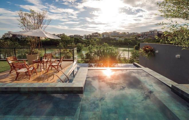 A cozinha é separada pela ilha em mármore branco Paraná, e para completar sua estética moderna, foi escolhido o revestimento invertido, na cor fendi. Já os banheiros ficaram sinalizados pelo pórtico verde – feito com plantas desidratadas – e por pranchas de madeira. O banheiro feminino é marcado pela delicadeza do revestimento Twenty Deluxe, na cor nude. E o masculino, pelo revestimento Inserto Tissue Black. No lado externo, os painéis de pedra Espanha, junto ao porcelanato Madero Imbuia, compõem o cenário da piscina, interligado a um pequeno jardim.