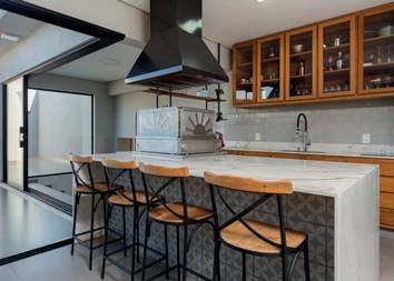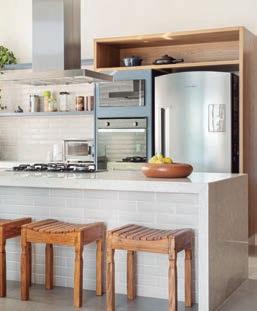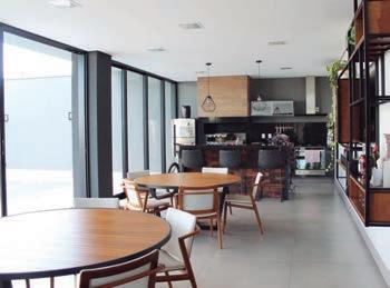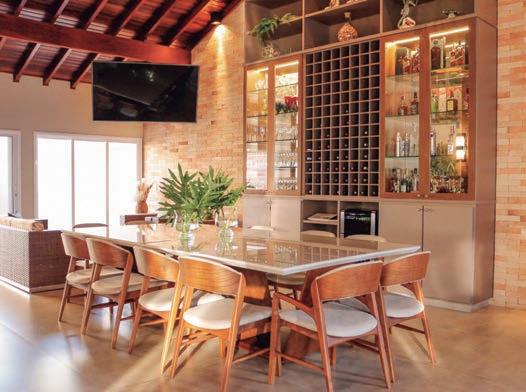 A cristaleira, a cervejeira e a chopeiraforamposicionadasemuma das extremidades,permitindofácil acesso. Outro destaque no ambiente são as banquetas que compõem o balcão e separaram visualmente a cozinha da área de churrasco.