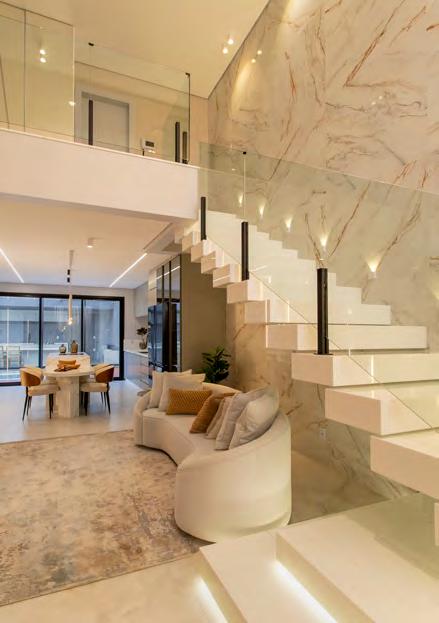 A cozinha interna tem ligação com a área gourmet, com a sala de jantar e com a sala de estar, priorizando os tons neutros. Todo esse ambiente recebe o Marmo D’oro nas paredes, que está em equilíbrio com a Pedra Calacata acetinada da bancada e da mesa, e com a escada que leva ao segundo andar, planejada em pedra Nanoglass branca com acabamento cristalizado.
