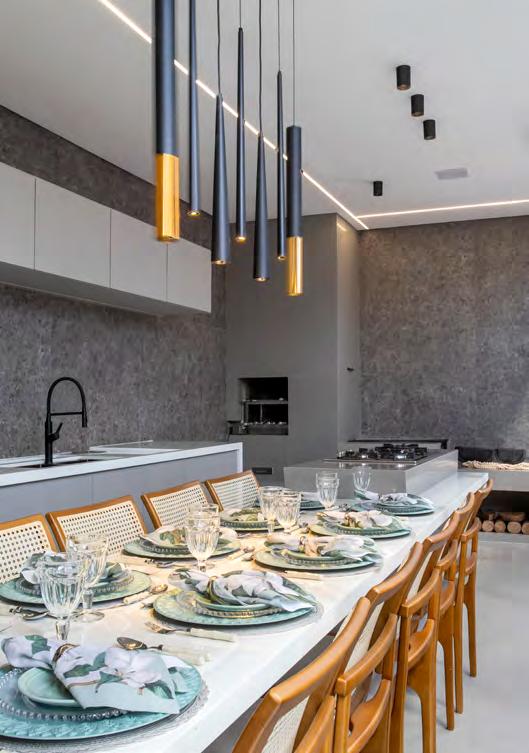 No ambiente integrado do térreo chamam a atenção o pé-direito duplo de 6 metros, que confere ainda maior amplitude ao local, e a parede da lareira revestida de pedras moledo. Essa parede avulta por sua dimensão, pois ocupa toda a altura do pé-direito. O aconchego do espaço se complementa com o projeto luminotécnico, composto por 20 pendentes com lâmpadas de filamento em iluminação quente.