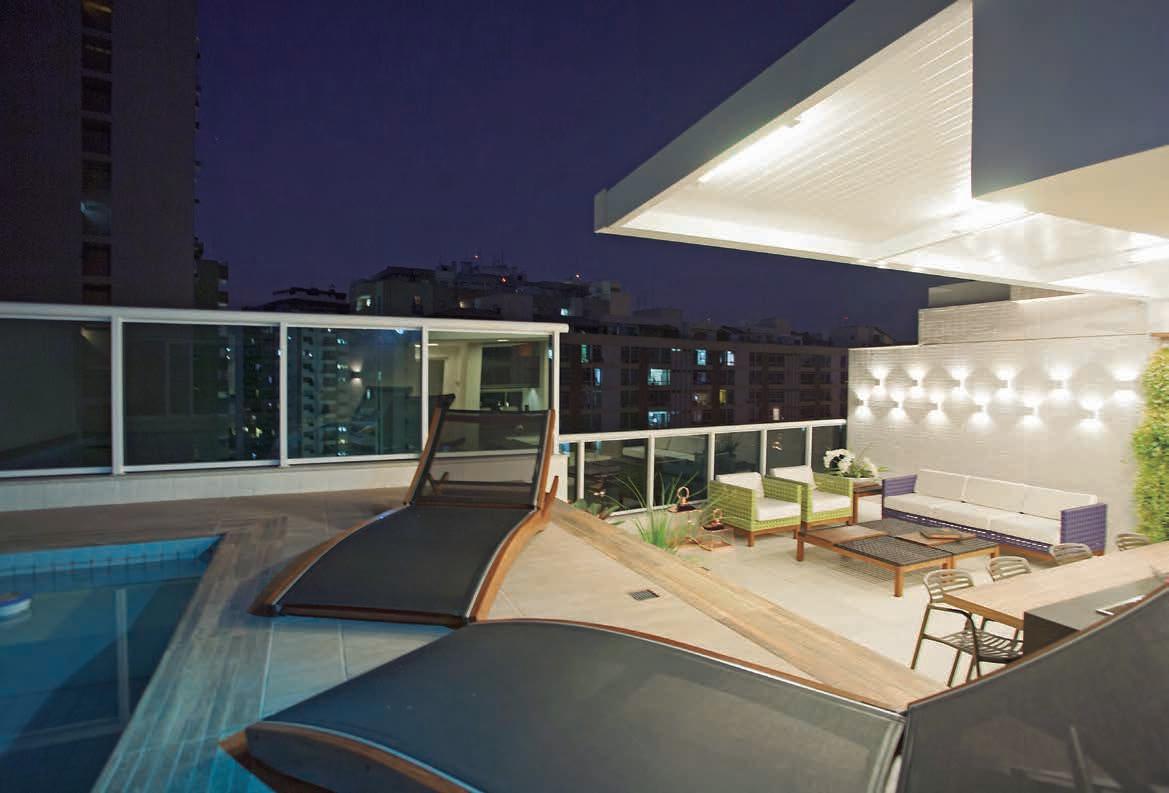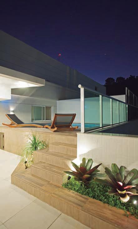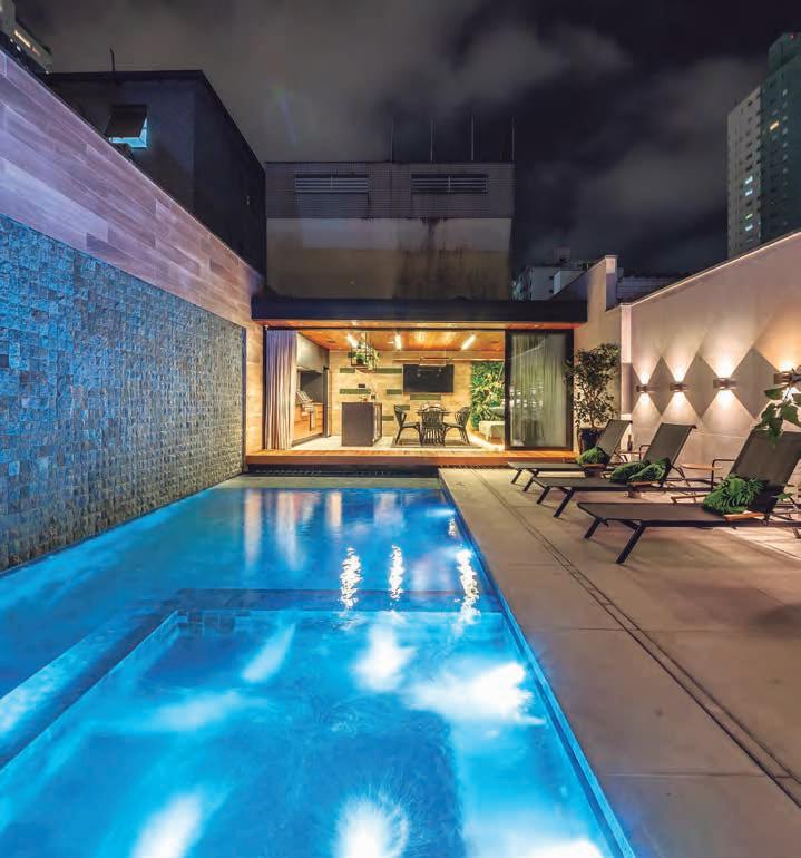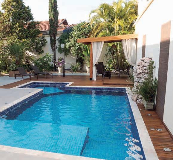 Este espaço foi projetado para que os moradores pudessem realizar o sonho de uma piscina suficientemente ampla para nadar e ainda reunir a família nos momentos de la zer. No seu entorno, o piso em porcelanato Giardino, 90x90cm, lembra um deck de madeira. Na parte interna da piscina, além da raia de 10x2m de largura, há uma “prainha”, com espaço para espreguiçadeiras e uma profundidade de apenas 20cm. Os degraus permitem maior co modidade de uso, enquanto a floreira – que está na divisa e de