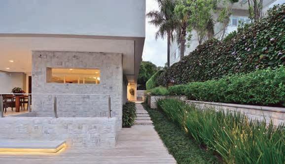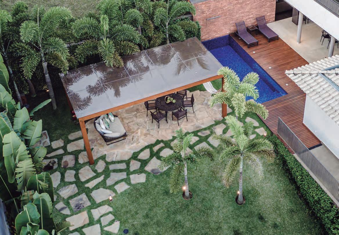 Ao lado, o pergolado traz sombra e aconchego. A valori zação do gramado deu-se pela mescla da grama com a área de piso, realçada por arbustos que florescem no verão. O projeto de iluminação foi cuidadosamente planejado para o perfeito uso no turno do espaço.